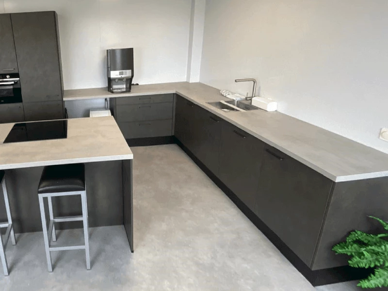 Gekozen is voor een Nobilia keuken in de kleur Decor Beton Terra Grijs. Het keukenblad van kunststof in de kleur Decor Beton Grijs combineert hier perfect bij. De betoonlook zorgt ervoor dat de keuken de tijdloze en strakke uitstraling krijgt. De strakke stijl zie je ook terug in de gekozen apparatuur; alle apparatuur is ingebouwd. Dit zorgt er ook voor dat de keuken netjes en rustig oogt. Het bedrijf heeft ervoor gekozen om op de vaatwasser en koelkast een doorlopend deurfront te laten bevestigen. Om opbergruimte te creëren is een voorraadkast in de keuken aangebracht. Op de kastdeuren zijn metalengrepen in de kleur Titanium aangebracht. Dit combineert goed met zowel de wasbak als de kraan, beide zijn van rvs. Omdat dit materiaal niet kan roesten is dit een duurzame optie.