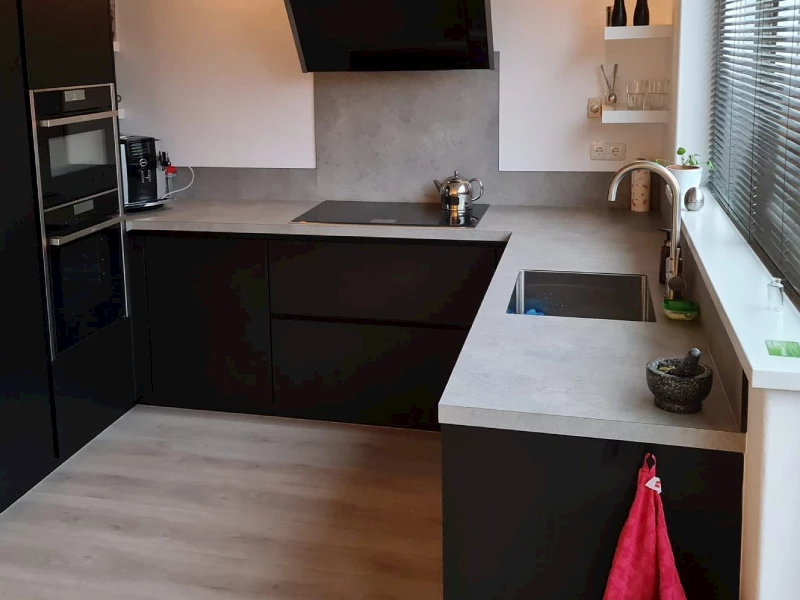 Betonlook keukens zijn op dit moment een echte trend, we zien ze dan ook veel terugkomen. Vaak bestaan deze keukens uit betonlook fronten, in combinatie met een donker en contrasterend werkblad. Deze keuken heeft een mat zwarte basis en een betonlook werkblad. Het is dus ook geen volledige betonlook keuken, maar bevat wel een betonlook toevoeging. Bij deze keuken kan je goed zien dat betonlook niet overheersend hoeft te zijn, maar ook subtiel kan worden aangebracht. Er is gekozen voor een lichte betonlook, maar betonlook is ook in andere kleuren en maten verkrijgbaar. Je kan zelfs kiezen tussen verschillende structuren, dit maakt betonlook veelzijdig.