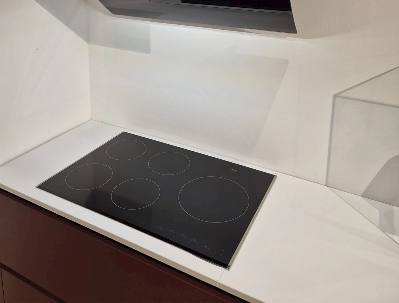 De volledige showroomkeuken Easytouch Roestrood Supermat is voorzien van fronten in de kleur Easytouch Roestrood Supermat. Op het rechte gedeelte ligt een composiet werkblad in de kleur Easy White. In de kastenwand bevindt zich de koelkast met vriesvak van Siemens en de oven van Pelgrim. De rechte zijde is voorzien van een inductiekookplaat van Pelgrim, een afzuigkap van Frilec en een vaatwasser van Beko.