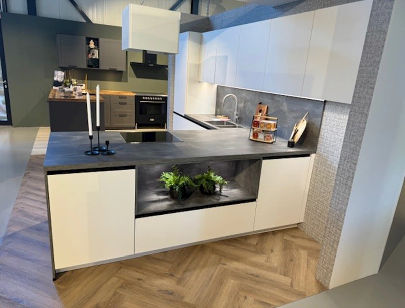 De volledige keuken is voorzien van fronten in de kleur Alpin Wit en zwarte greeplijsten. Op de keuken ligt een kunststoffen werkblad met betonlook, waardoor deze keuken een strakke look heeft. Dit blad is doorgetrokken op de achterwand en voorzien van geïntegreerde verlichting. De apparatuurset bestaat uit een inductiekookplaat, vaatwasser, oven en koel-vriescombinatie van Junker en een Airforce recirculatie afzuigkap.